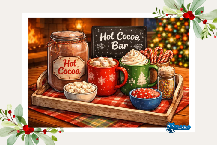 Keep cocoa mix, a few mugs, and a couple of toppings like marshmallows or candy canes ready on a small tray. After you or the kids shovel, everyone comes in, drops snowy gear in the same spot, and builds a mug of cocoa.